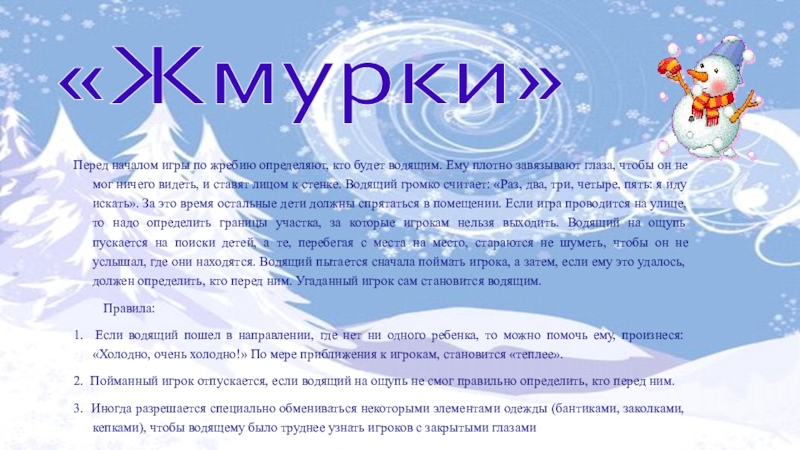 завязывают глаза, чтобы он не мог ничего видеть, и ставят лицом к стенке. Водящий громко считает: «Раз, два, три, четыре, пять: я иду искать». За это время остальные дети должны спрятаться в помещении. Если игра проводится на улице, то надо определить границы участка, за которые игрокам нельзя выходить. Водящий на ощупь пускается на поиски детей, а те, перебегая с места на место, стараются не шуметь, чтобы он не услышал, где они находятся. Водящий пытается сначала поймать игрока, а затем, если ему это удалось, должен определить, кто перед ним. Угаданный игрок сам становится водящим.
