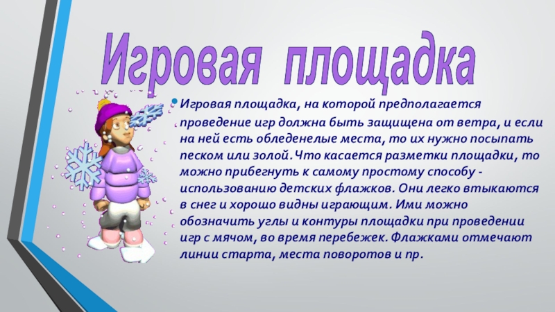 от ветра, и если на ней есть обледенелые места, то их нужно посыпать песком или золой. Что касается разметки площадки, то можно прибегнуть к самому простому способу - использованию детских флажков. Они легко втыкаются в снег и хорошо видны играющим. Ими можно обозначить углы и контуры площадки при проведении игр с мячом, во время перебежек. Флажками отмечают линии старта, места поворотов и пр.