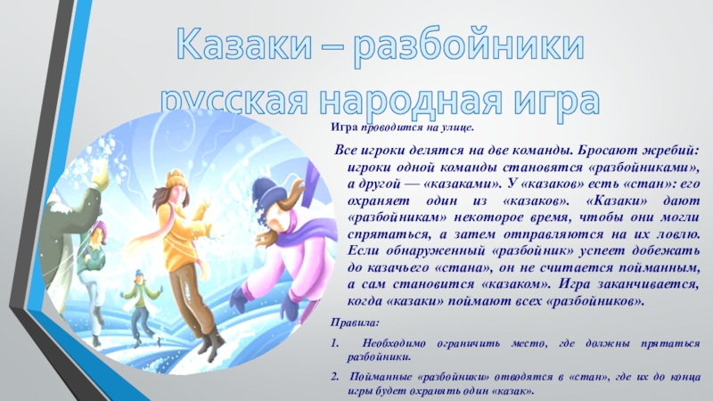 делятся на две команды. Бросают жребий: игроки одной команды становятся «разбойниками», а другой — «казаками». У «казаков» есть «стан»: его охраняет один из «казаков». «Казаки» дают «разбойникам» некоторое время, чтобы они могли спрятаться, а затем отправляются на их ловлю. Если обнаруженный «разбойник» успеет добежать до казачьего «стана», он не считается пойманным, а сам становится «казаком». Игра заканчивается, когда «казаки» поймают всех «разбойников».
