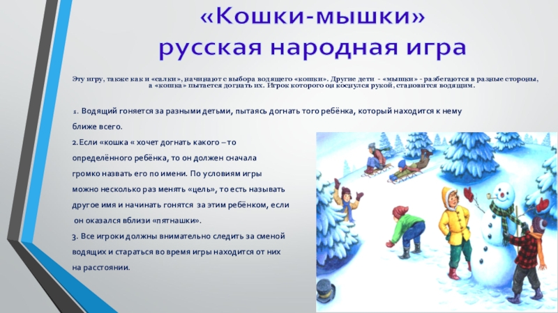 водящего «кошки». Другие дети - «мышки» - разбегаются в разные стороны, а «кошка» пытается догнать их. Игрок которого он коснулся рукой, становится водящим.