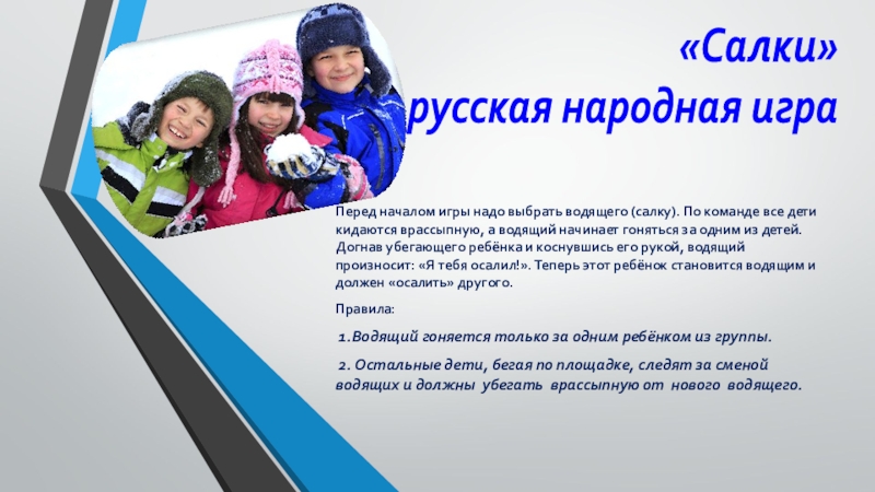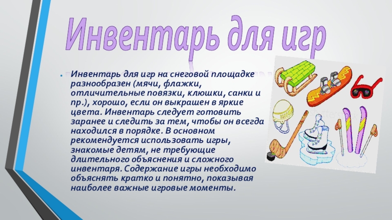 отличительные повязки, клюшки, санки и пр.), хорошо, если он выкрашен в яркие цвета. Инвентарь следует готовить заранее и следить за тем, чтобы он всегда находился в порядке. В основном рекомендуется использовать игры, знакомые детям, не требующие длительного объяснения и сложного инвентаря. Содержание игры необходимо объяснять кратко и понятно, показывая наиболее важные игровые моменты.