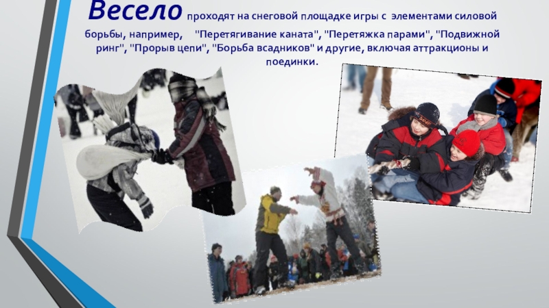 Слайд 17Весело проходят на снеговой площадке игры с элементами силовой борьбы, например,