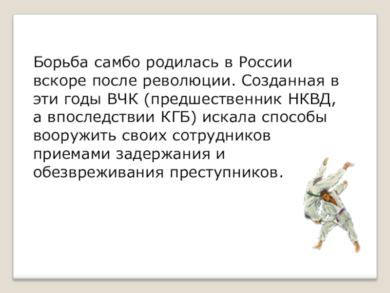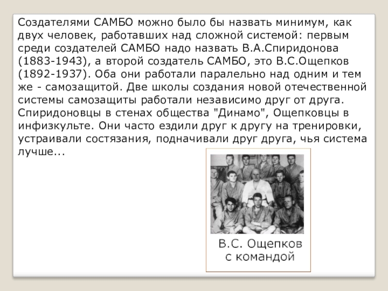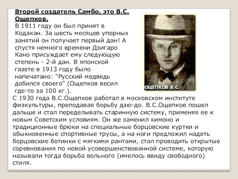 С 1930 года В.С.Ощепков работал в московском институте физкультуры, преподавая борьбу дзю-до. В.С.Ощепков пошел дальше и стал переделывать старинную систему, применяя ее к новым Советским условиям. Он же заменил кимоно и традиционные брюки на специальные борцовские куртки и обыкновенные спортивные трусы, а на ноги предложил надеть борцовские ботинки с мягкими рантами, стал проводить открытые соревнования по новой усовершенствованной системе, которую называли тогда борьба вольного (имелось ввиду свободного) стиля.