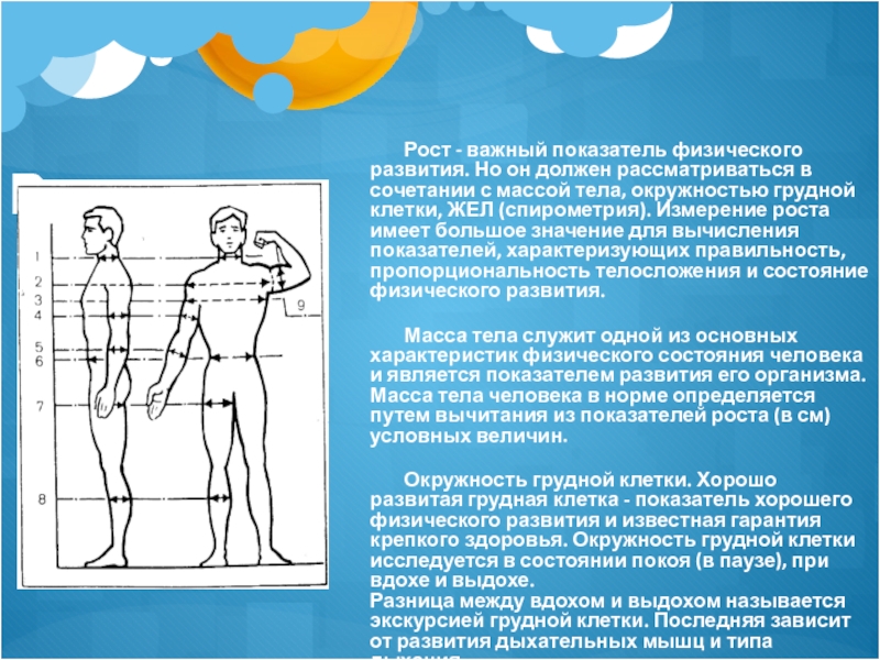 с массой тела, окружностью грудной клетки, ЖЕЛ (спирометрия). Измерение роста имеет большое значение для вычисления показателей, характеризующих правильность, пропорциональность телосложения и состояние физического развития.