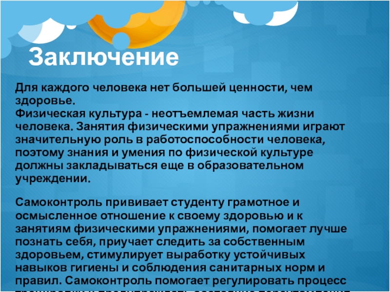 Самоконтроль прививает студенту грамотное и осмысленное отношение к своему здоровью и к занятиям физическими упражнениями, помогает лучше познать себя, приучает следить за собственным здоровьем, стимулирует выработку устойчивых навыков гигиены и соблюдения санитарных норм и правил. Самоконтроль помогает регулировать процесс тренировки и предупреждать состояние переутомления.