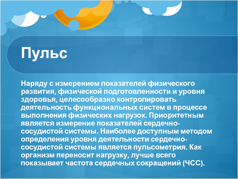 целесообразно контролировать деятельность функциональных систем в процессе выполнения физических нагрузок. Приоритетным является измерение показателей сердечно-сосудистой системы. Наиболее доступным методом определения уровня деятельности сердечно-сосудистой системы является пульсометрия. Как организм переносит нагрузку, лучше всего показывает частота сердечных сокращений (ЧСС).