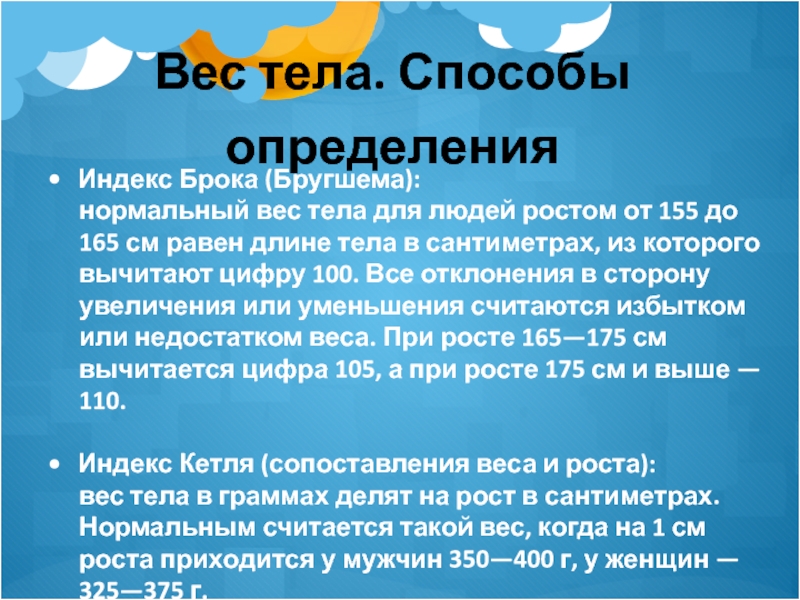 Масса тела служит одной из основных характеристик физического состояния человека и является показателем развития его организма. Масса тела человека в норме определяется путем вычитания из показателей роста (в см) условных величин.