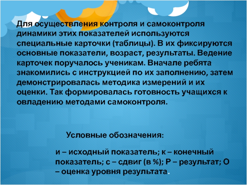 Слайд 5Для осуществления контроля и самоконтроля динамики этих показателей используются специальные карточки