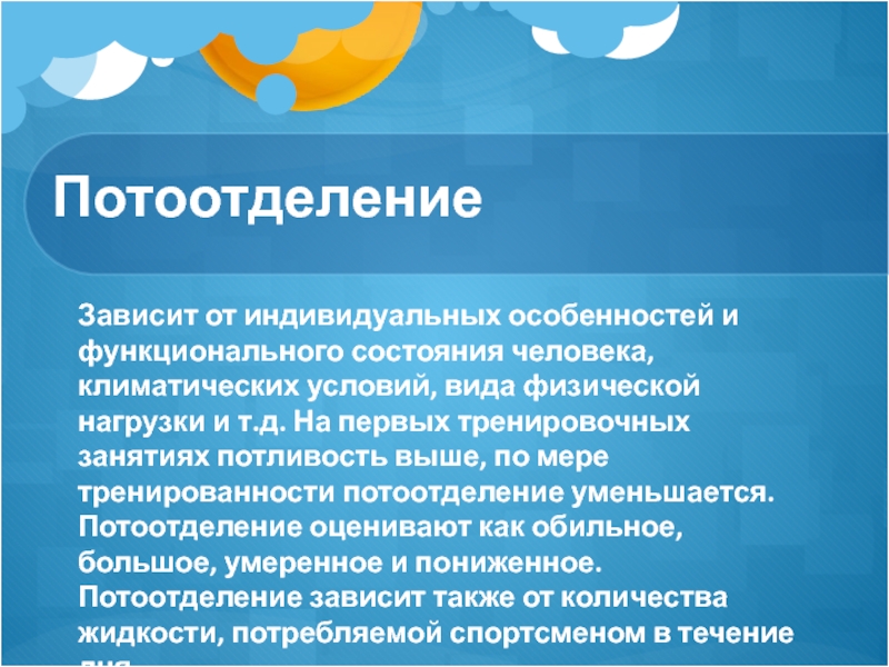 физической нагрузки и т.д. На первых тренировочных занятиях потливость выше, по мере тренированности потоотделение уменьшается. Потоотделение оценивают как обильное, большое, умеренное и пониженное. Потоотделение зависит также от количества жидкости, потребляемой спортсменом в течение дня.