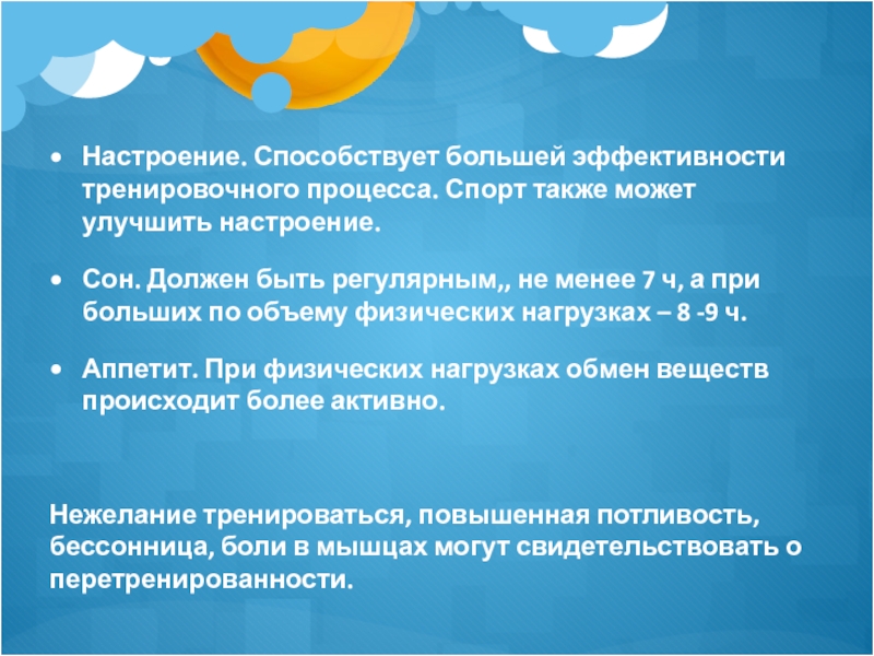 Слайд 21Настроение. Способствует большей эффективности тренировочного процесса. Спорт также может улучшить настроение.