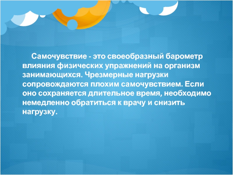 Слайд 20Самочувствие - это своеобразный барометр влияния физических упражнений на организм занимающихся.