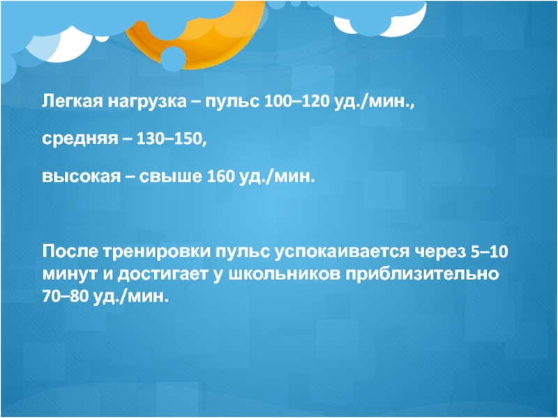 Слайд 14Легкая нагрузка – пульс 100–120 уд./мин.,