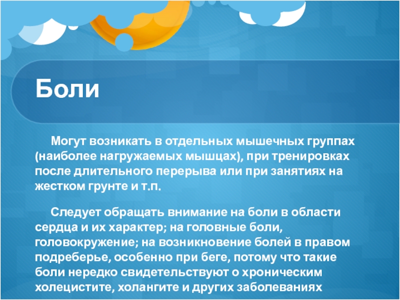 Следует обращать внимание на боли в области сердца и их характер; на головные боли, головокружение; на возникновение болей в правом подреберье, особенно при беге, потому что такие боли нередко свидетельствуют о хроническим холецистите, холангите и других заболеваниях печени.