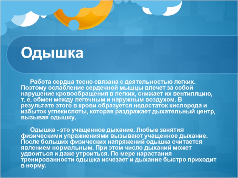 Одышка - это учащенное дыхание. Любые занятия физическими упражнениями вызывают учащенное дыхание. После больших физических напряжений одышка считается явлением нормальным. При этом число дыханий может удвоиться и даже утроиться. По мере нарастания тренированности одышка исчезает и дыхание быстро приходит в норму.