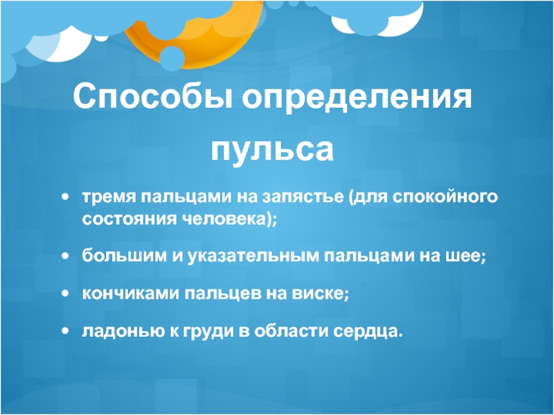 После тренировки пульс успокаивается через 5–10 минут и достигает у школьников приблизительно 70–80 уд./мин.