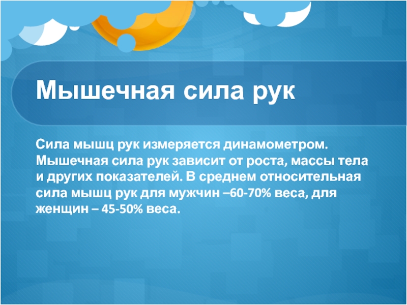 от роста, массы тела и других показателей. В среднем относительная сила мышц рук для мужчин –60-70% веса, для женщин – 45-50% веса.