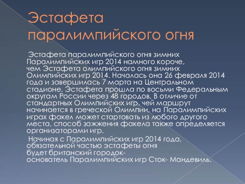 Эстафета паралимпийского огня   Эстафета паралимпийского огня зимних Паралимпийских игр 2014 намного короче, чем Эстафета олимпийского огня