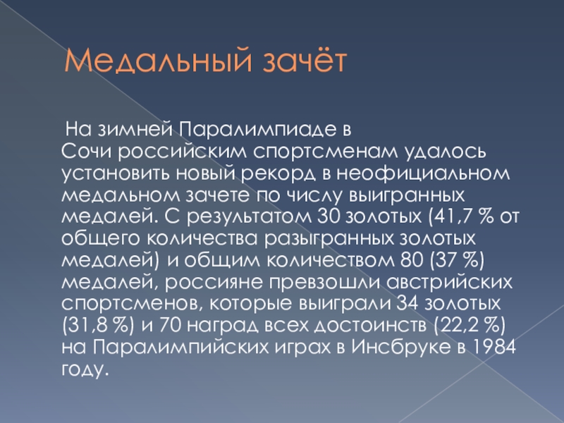 Медальный зачёт   На зимней Паралимпиаде в Сочи российским спортсменам удалось установить новый рекорд в неофициальном медальном зачете