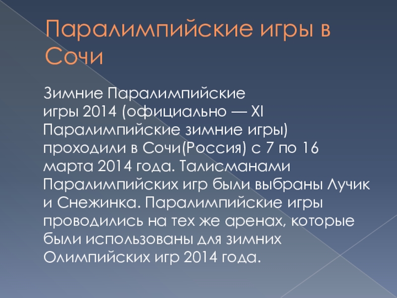 Паралимпийские игры в Сочи  Зимние Паралимпийские игры 2014 (официально — XI Паралимпийские зимние игры) проходили в Сочи(Россия) с 7 по 16 марта 2014