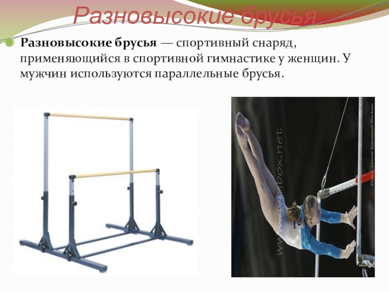 В современной программе гимнастического многоборья: для женщин — на брусьях разной высоты, бревне, в опорных прыжках, вольных упражнениях; для мужчин — в вольных упражнениях, опорных прыжках, на коне, кольцах, параллельных брусьях и перекладине.