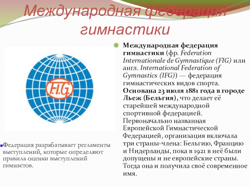Федерация разрабатывает регламенты выступлений, которые определяют правила оценки выступлений гимнастов.