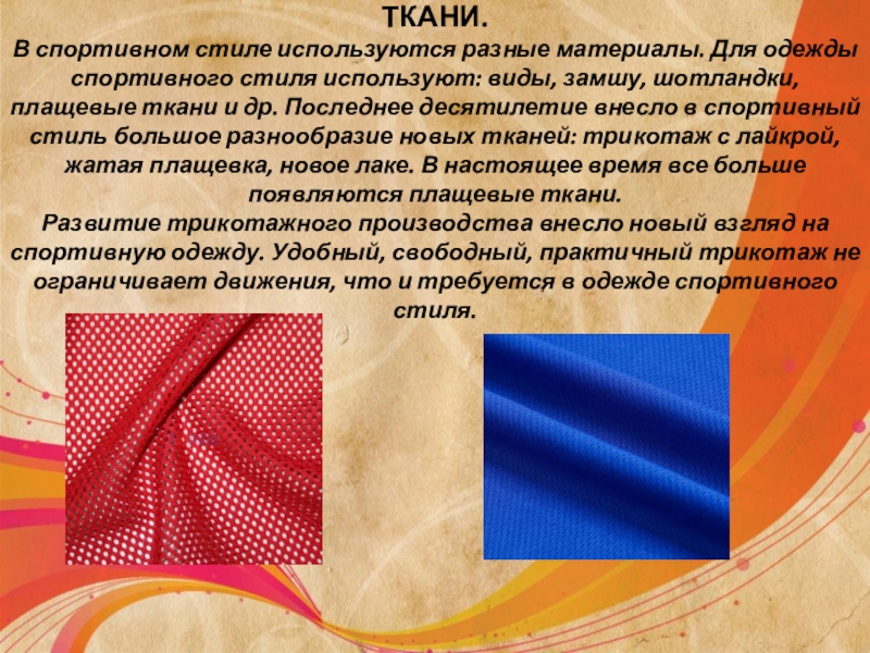 виды, замшу, шотландки, плащевые ткани и др. Последнее десятилетие внесло в спортивный стиль большое разнообразие новых тканей: трикотаж с лайкрой, жатая плащевка, новое лаке. В настоящее время все больше появляются плащевые ткани. Развитие трикотажного производства внесло новый взгляд на спортивную одежду. Удобный, свободный, практичный трикотаж не ограничивает движения, что и требуется в одежде спортивного стиля.