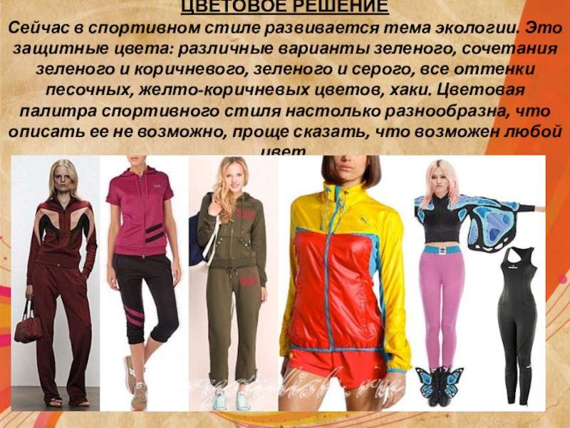 Слайд 4ЦВЕТОВОЕ РЕШЕНИЕ Сейчас в спортивном стиле развивается тема экологии. Это защитные цвета:
