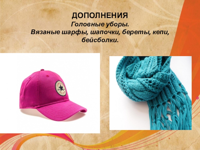 Слайд 6ДОПОЛНЕНИЯ Головные уборы. Вязаные шарфы, шапочки, береты, кепи, бейсболки.