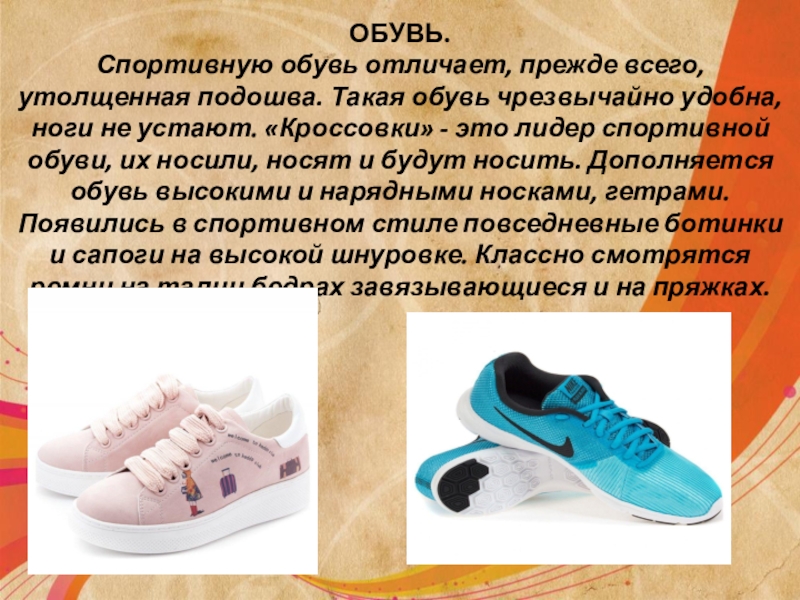 Слайд 7ОБУВЬ. Спортивную обувь отличает, прежде всего, утолщенная подошва. Такая обувь чрезвычайно удобна,
