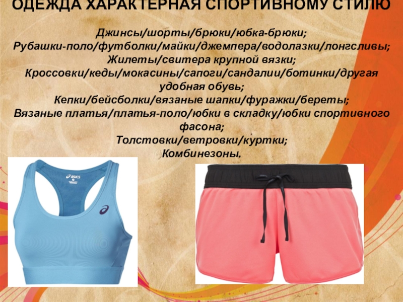 Слайд 8ОДЕЖДА ХАРАКТЕРНАЯ СПОРТИВНОМУ СТИЛЮ   Джинсы/шорты/брюки/юбка-брюки; Рубашки-поло/футболки/майки/джемпера/водолазки/лонгсливы; Жилеты/свитера крупной вязки; Кроссовки/кеды/мокасины/сапоги/сандалии/ботинки/другая удобная обувь; Кепки/бейсболки/вязаные шапки/фуражки/береты; Вязаные платья/платья-поло/юбки в