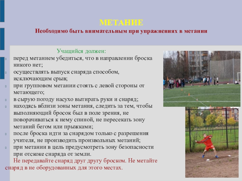 Песок в яме для приземления должен быть влажным, хорошо взрыхленным, а его поверхность должна находиться на одном уровне с поверхностью дорожки для разбега. Перед выполнением прыжков необходимо убрать из ямы грабли, лопаты и другие посторонние предметы.