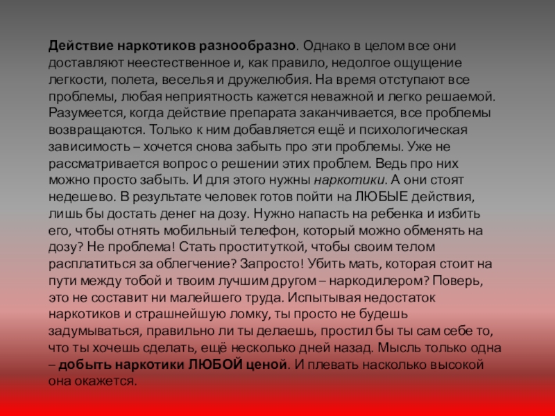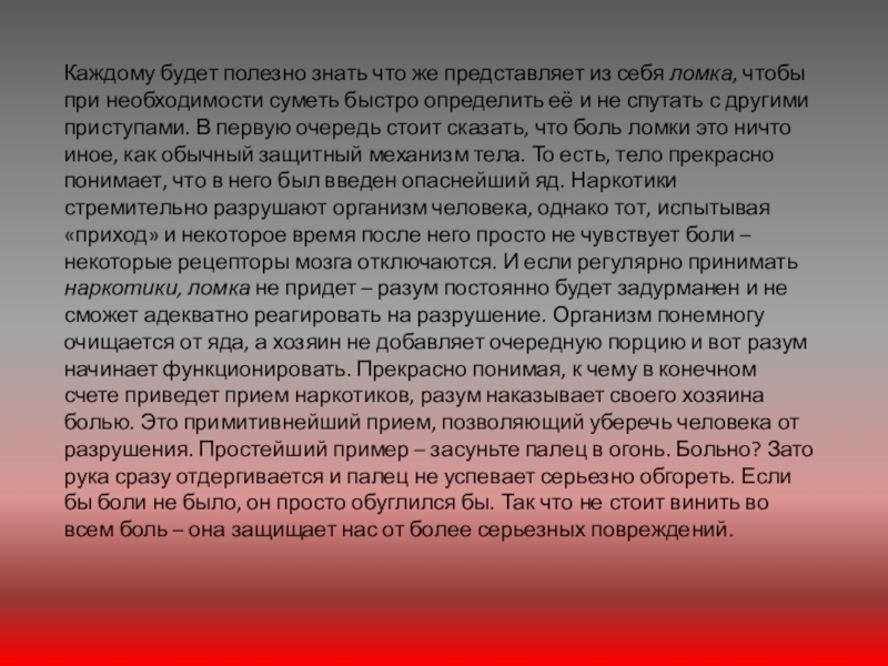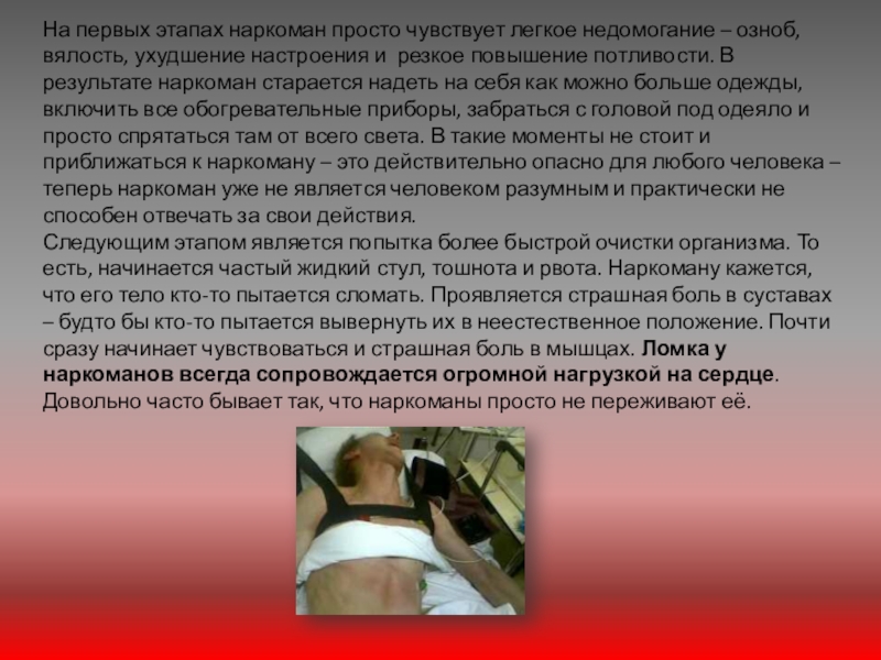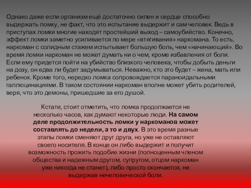 Однако даже если организм ещё достаточно силен и сердце способно выдержать ломку, не факт, что это испытание выдержит и сам человек. Ведь в приступах ломки многие находят простейший выход – самоубийство. Конечно, эффект ломки заметно усиливается по мере «втягивания» наркомана. То есть, наркоман с солидным стажем испытывает большую боль, чем «начинающий». Во время ломки наркоман не может думать ни о чем, кроме избавления от боли. Если ему придется пойти на убийство близкого человека, чтобы добыть деньги на дозу, он едва ли будет задумываться. Неважно, кто это будет – жена, мать или ребенок. Кроме того, нередко ломка сопровождается параноидальными галлюцинациями. В таком состоянии наркоман вполне может убить родителей, веря, что это демоны, пришедшие за его душой.