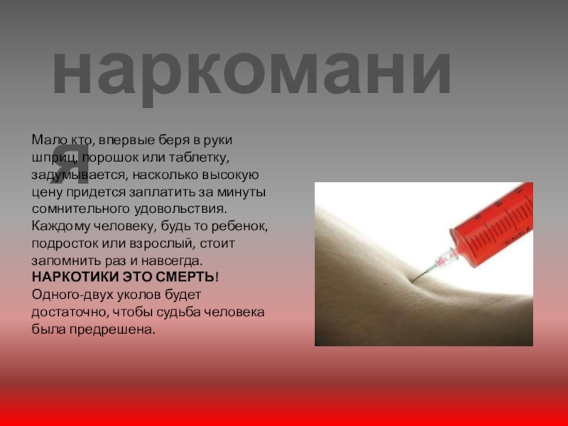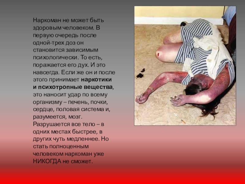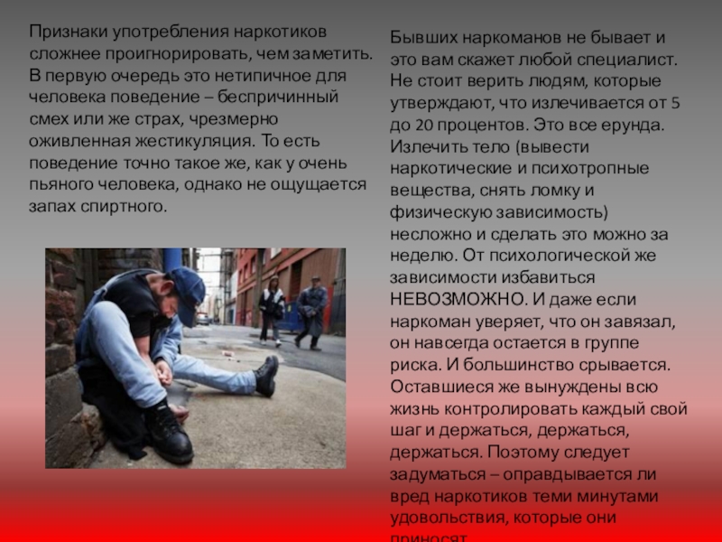 Бывших наркоманов не бывает и это вам скажет любой специалист. Не стоит верить людям, которые утверждают, что излечивается от 5 до 20 процентов. Это все ерунда. Излечить тело (вывести наркотические и психотропные вещества, снять ломку и физическую зависимость) несложно и сделать это можно за неделю. От психологической же зависимости избавиться НЕВОЗМОЖНО. И даже если наркоман уверяет, что он завязал, он навсегда остается в группе риска. И большинство срывается. Оставшиеся же вынуждены всю жизнь контролировать каждый свой шаг и держаться, держаться, держаться. Поэтому следует задуматься – оправдывается ли вред наркотиков теми минутами удовольствия, которые они приносят.