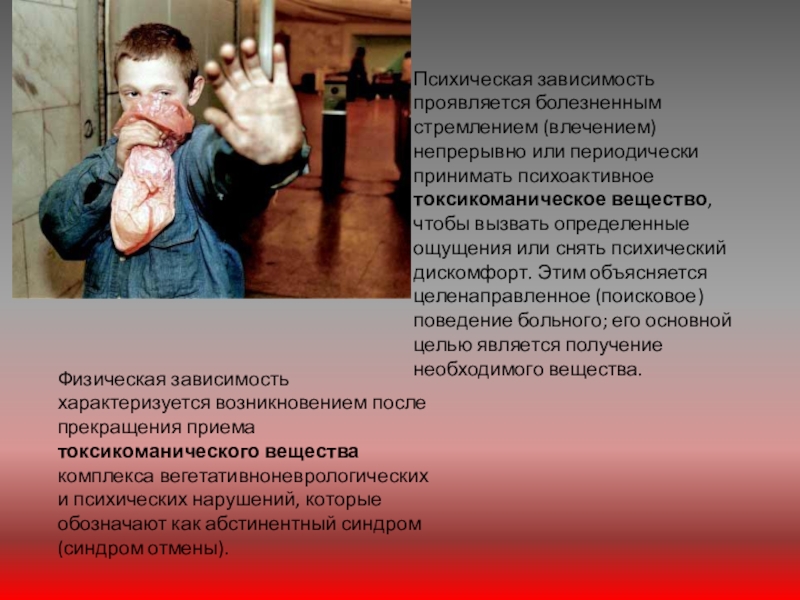Физическая зависимость характеризуется возникновением после прекращения приема токсикоманического вещества комплекса вегетативноневрологических и психических нарушений, которые обозначают как абстинентный синдром (синдром отмены).