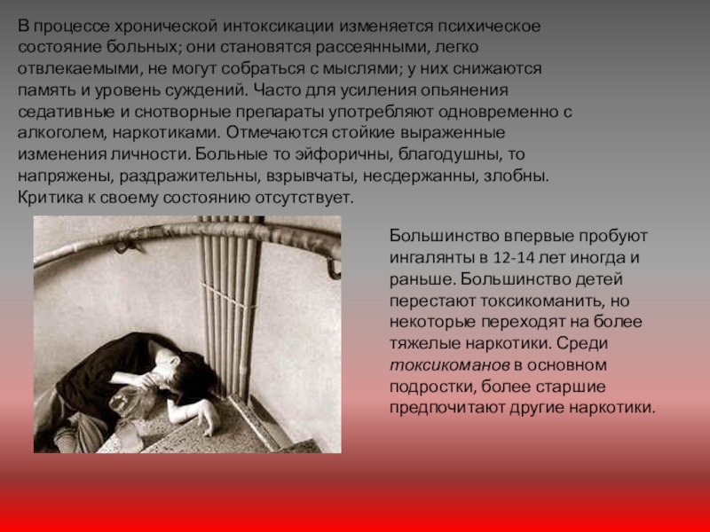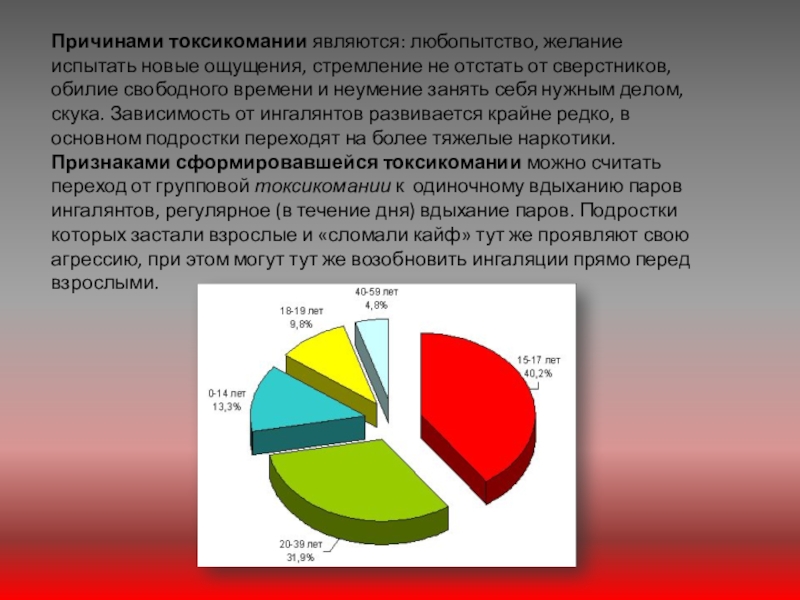 Большинство впервые пробуют ингалянты в 12-14 лет иногда и раньше. Большинство детей перестают токсикоманить, но некоторые переходят на более тяжелые наркотики. Среди токсикоманов в основном подростки, более старшие предпочитают другие наркотики.