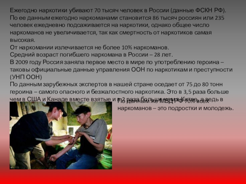 По данным же МВД РФ 70% всех наркоманов – это подростки и молодежь.