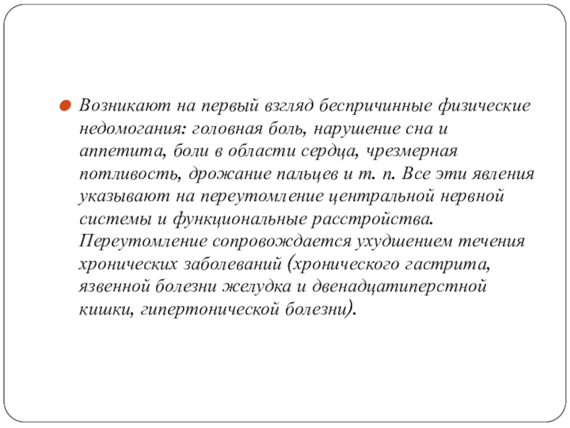 и аппетита, боли в области сердца, чрезмерная потливость, дрожание пальцев и т. п. Все эти явления указывают на переутомление центральной нервной системы и функциональные расстройства. Переутомление сопровождается ухудшением течения хронических заболеваний (хронического гастрита, язвенной болезни желудка и двенадцатиперстной кишки, гипертонической болезни).