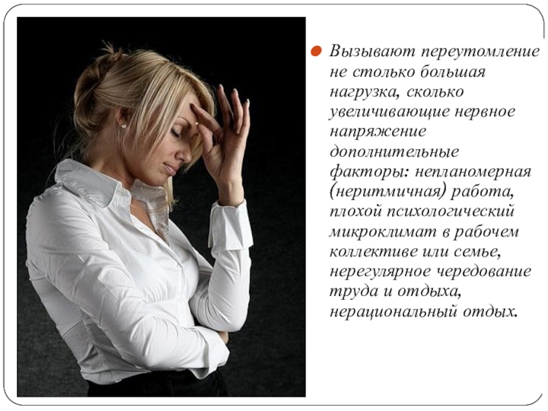 Слайд 10Вызывают переутомление не столько большая нагрузка, сколько увеличивающие нервное напряжение дополнительные