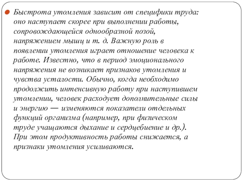 Слайд 5Быстрота утомления зависит от специфики труда: оно наступает скорее при выполнении