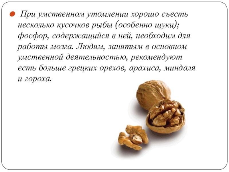 Слайд 13 При умственном утомлении хорошо съесть несколько кусочков рыбы (особенно щуки);