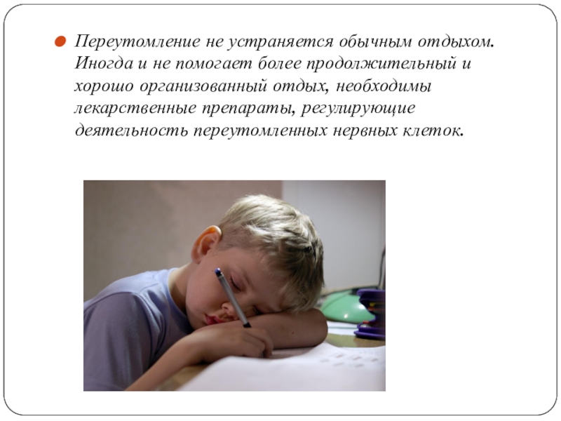Слайд 9Переутомление не устраняется обычным отдыхом. Иногда и не помогает более продолжительный