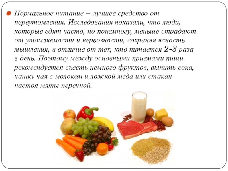 Слайд 12Нормальное питание – лучшее средство от переутомления. Исследования показали, что люди,