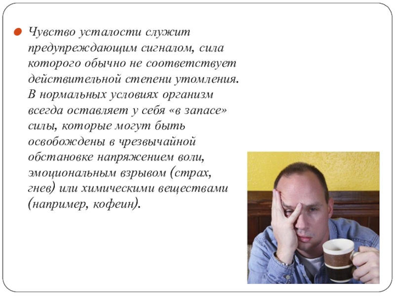 Слайд 3Чувство усталости служит предупреждающим сигналом, сила которого обычно не соответствует действительной