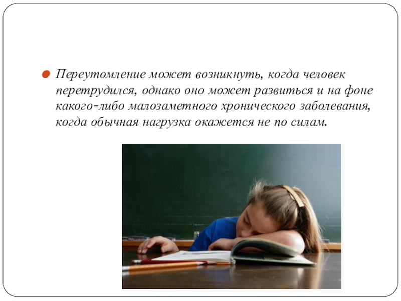Слайд 7Переутомление может возникнуть, когда человек перетрудился, однако оно может развиться и