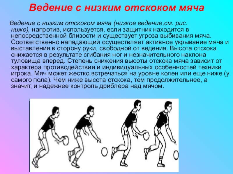 (низкое ведение,см. рис.ниже), напротив, используется, если защитник находится в непосредственной близости и существует угроза выбивания мяча. Соответственно нападающий осуществляет активное укрывание мяча и выставления в сторону руки, свободной от ведения. Высота отскока снижается в результате сгибания ног и незначительного наклона туловища вперед. Степень снижения высоты отскока мяча зависит от характера противодействия и индивидуальных особенностей техники игрока. Мяч может жестко встречаться на уровне колен или еще ниже (у самого пола). Чем ниже высота отскока, тем продолжительнее, а значит, и надежнее контроль дриблера над мячом.
