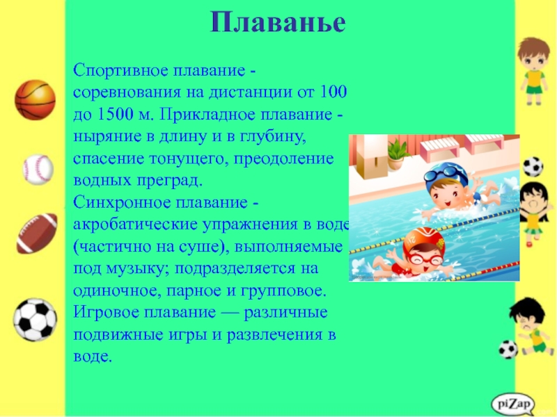 Спортивное плавание - соревнования на дистанции от 100 до 1500 м. Прикладное плавание - ныряние в длину и в глубину, спасение тонущего, преодоление водных преград.
