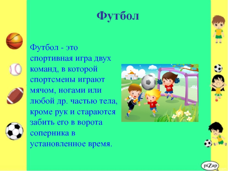 Футбол - это спортивная игра двух команд, в которой спортсмены играют мячом, ногами или любой др. частью тела, кроме рук и стараются забить его в ворота соперника в установленное время.