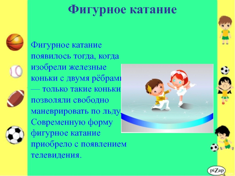 Фигурное катание появилось тогда, когда изобрели железные коньки с двумя рёбрами — только такие коньки позволяли свободно маневрировать по льду. Современную форму фигурное катание приобрело с появлением телевидения.