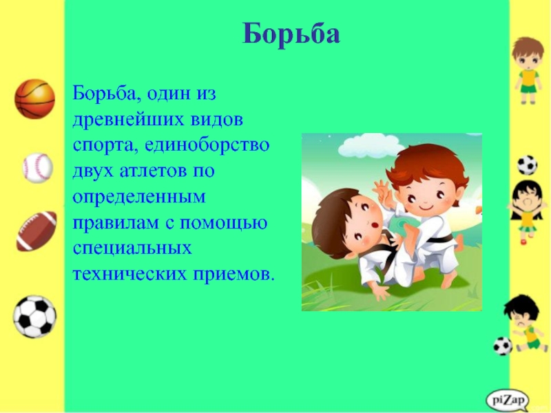 Борьба, один из древнейших видов спорта, единоборство двух атлетов по определенным правилам с помощью специальных технических приемов.