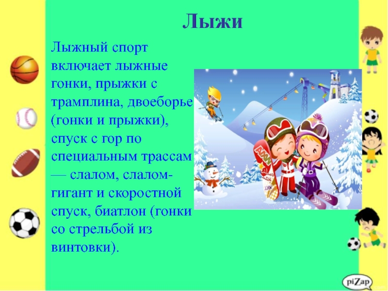 Лыжный спорт включает лыжные гонки, прыжки с трамплина, двоеборье (гонки и прыжки), спуск с гор по специальным трассам — слалом, слалом-гигант и скоростной спуск, биатлон (гонки со стрельбой из винтовки).